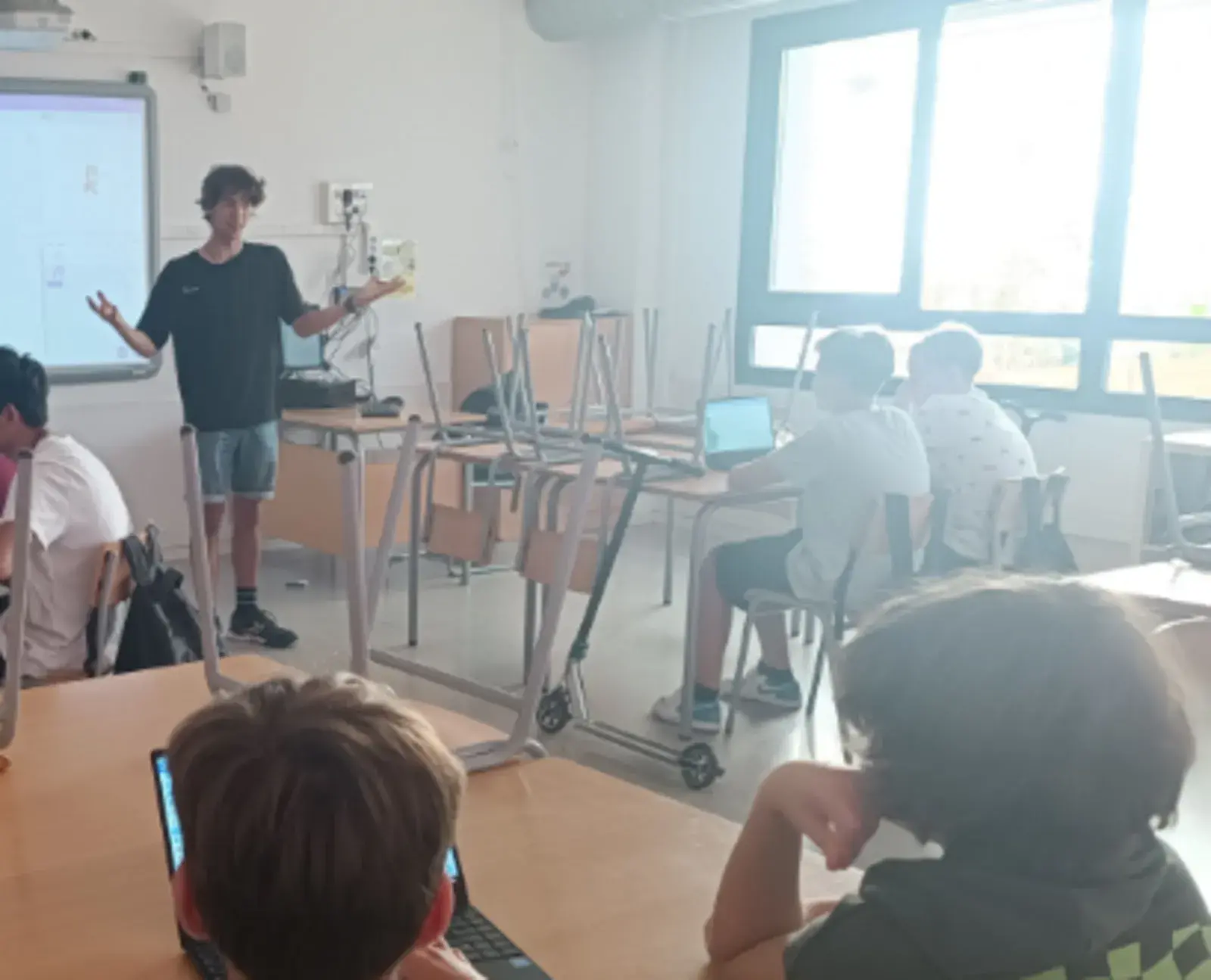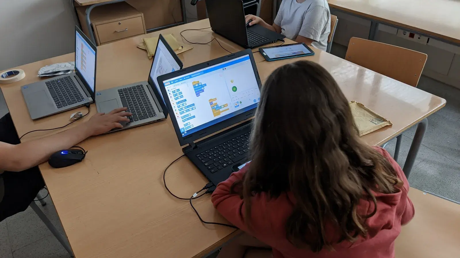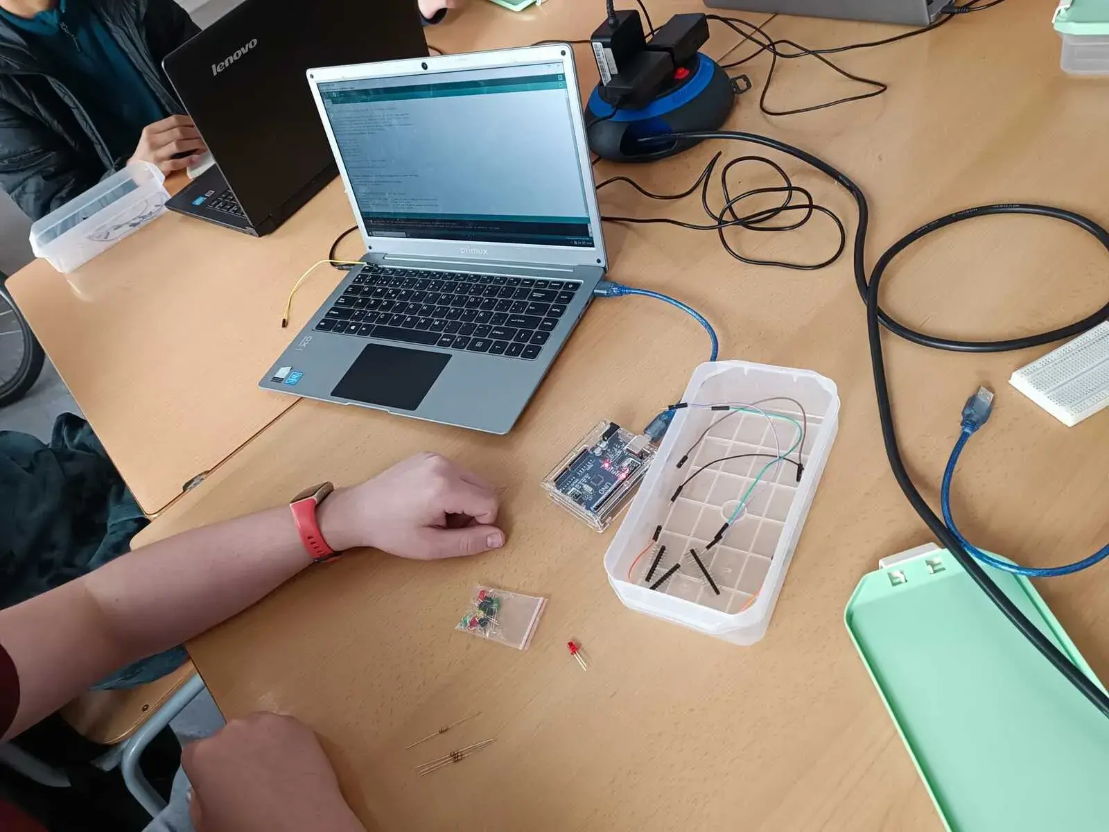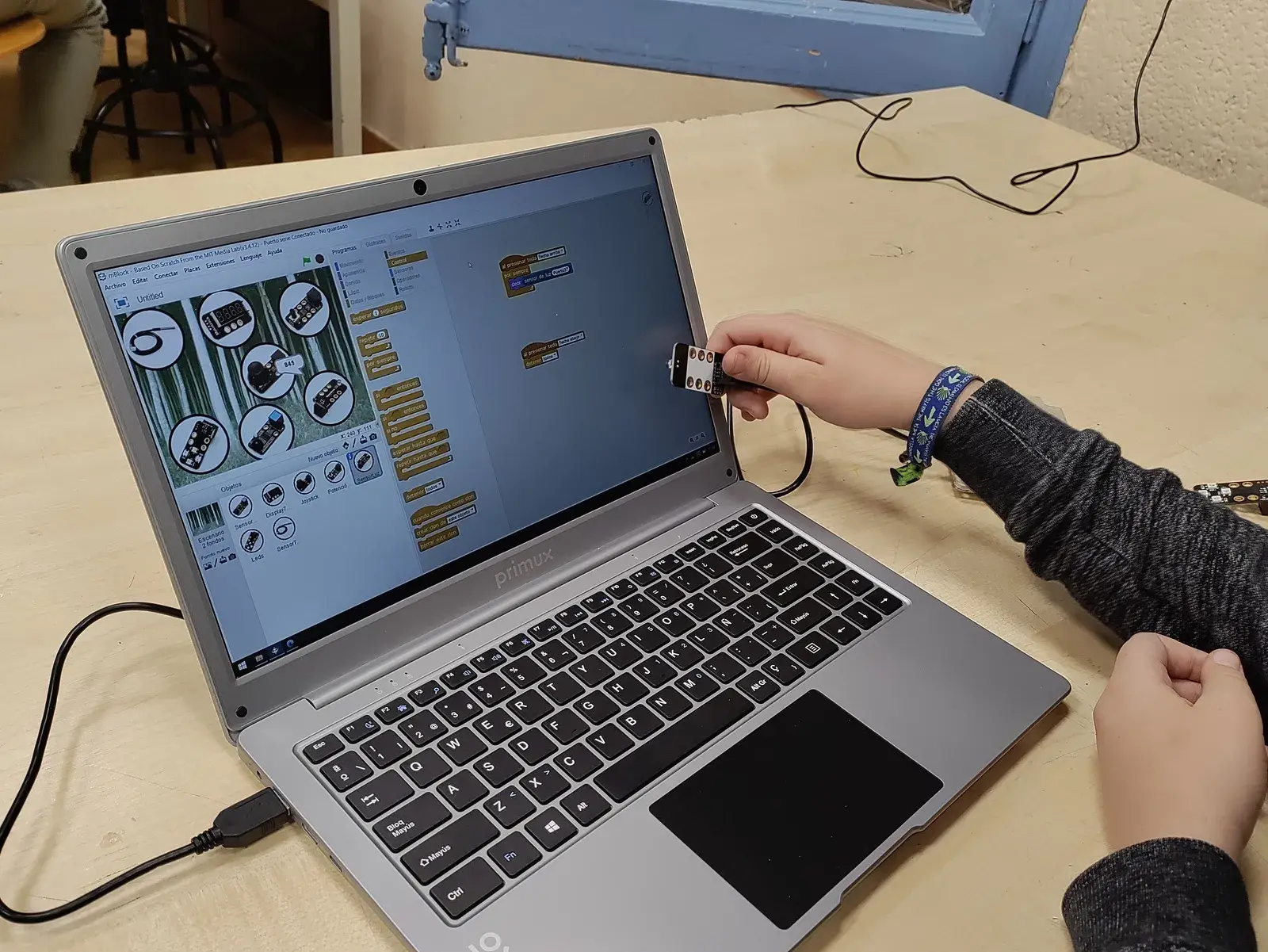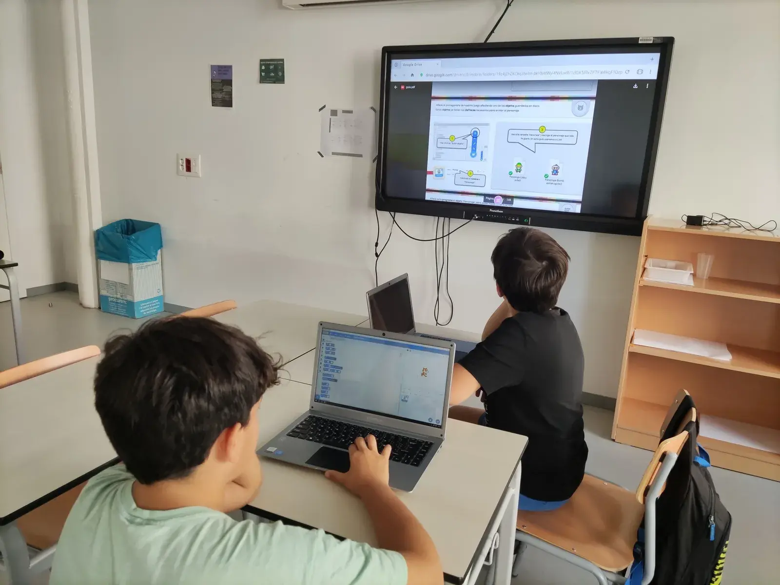Cada parella va seguint el material didàctic per resoldre reptes relacionats amb la robòtica i la programació. Proposem diversos llenguatges de programació professionals i elements de hardware que s’adapten a l’edat dels alumnes. Poc a poc van desenvolupant més habilitats tecnològiques fins al punt de poder crear els seus propis projectes de forma semi-autònoma.