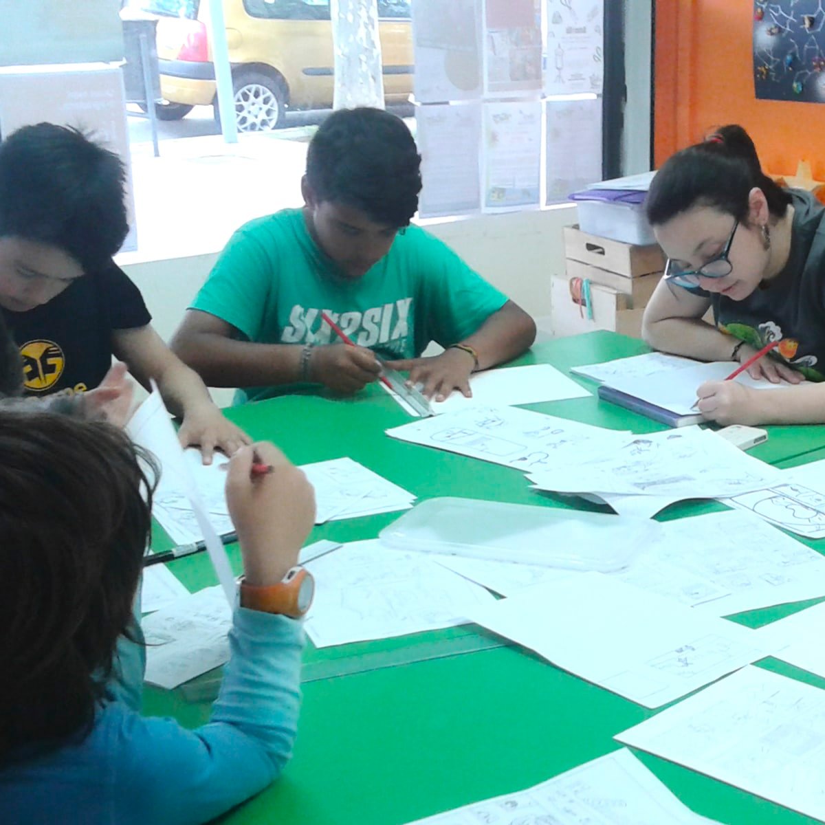 L’activitat de còmic és un curs progressiu. Comencem amb aspectes bàsics d’il·lustració (bàsics no vol dir simples, si no de base), aspectes que reforcen i milloren aquells que ja les coneixen i les aprenen de nou aquells qui no. En el segon trimestre ja entrem en el llenguatge del còmic i al tercer trimestre en el procés d’el·laboració del nostre còmic.