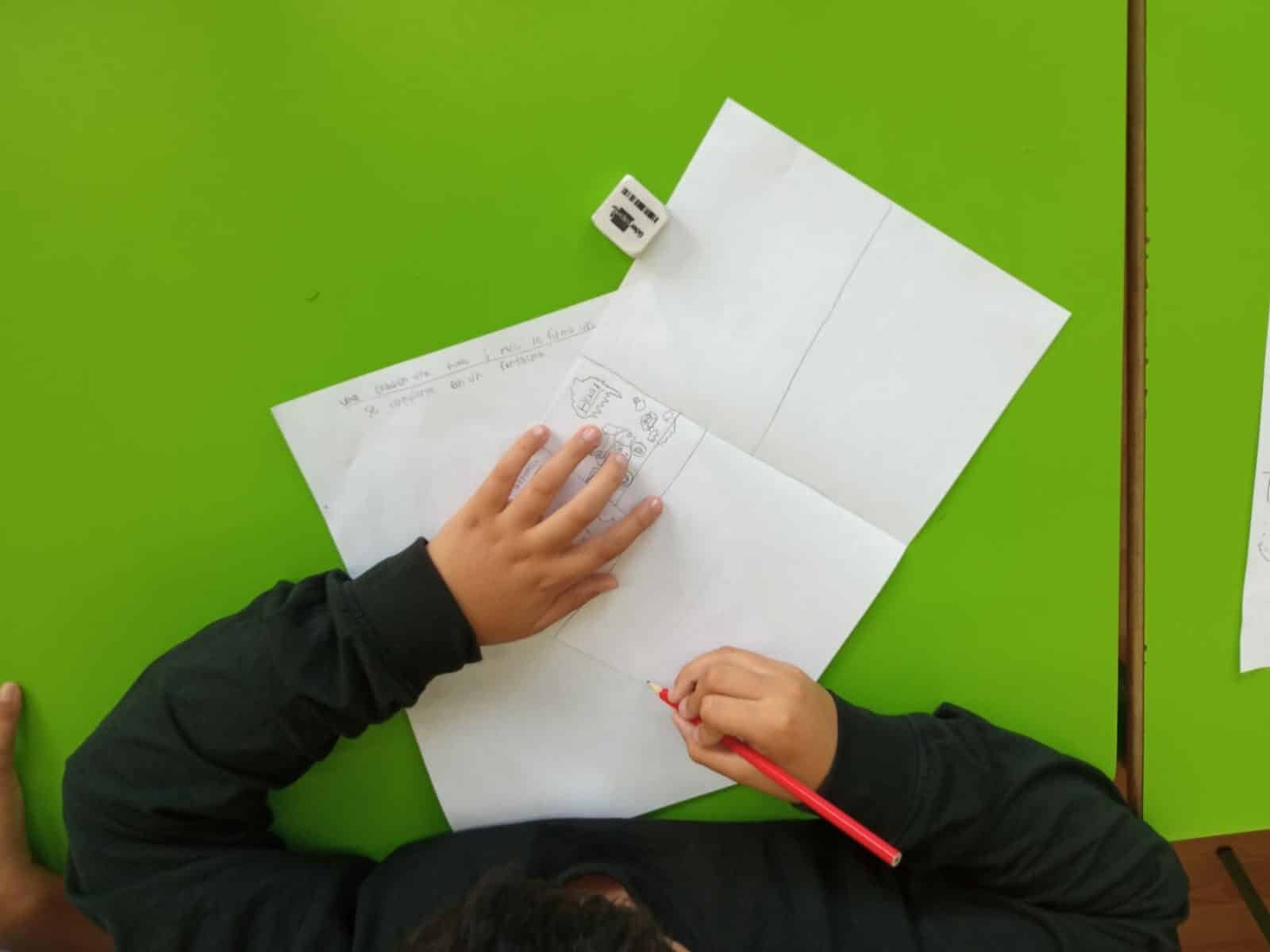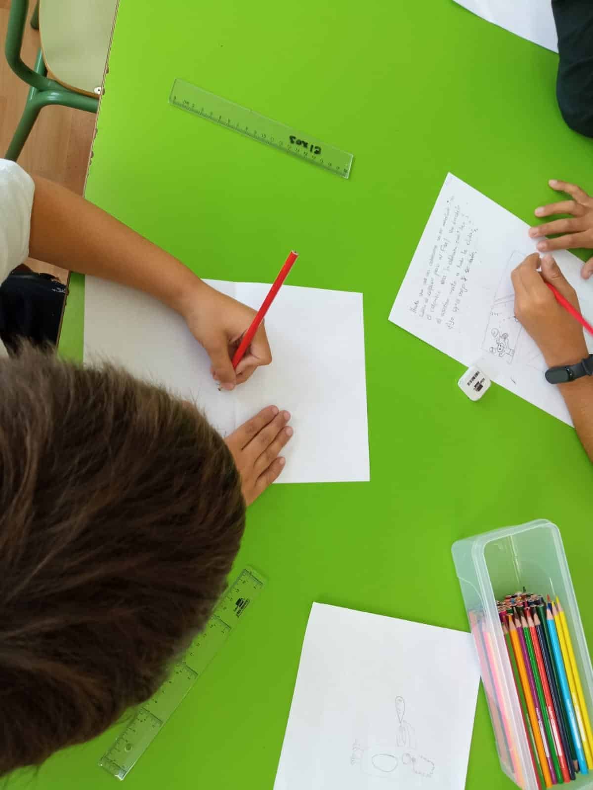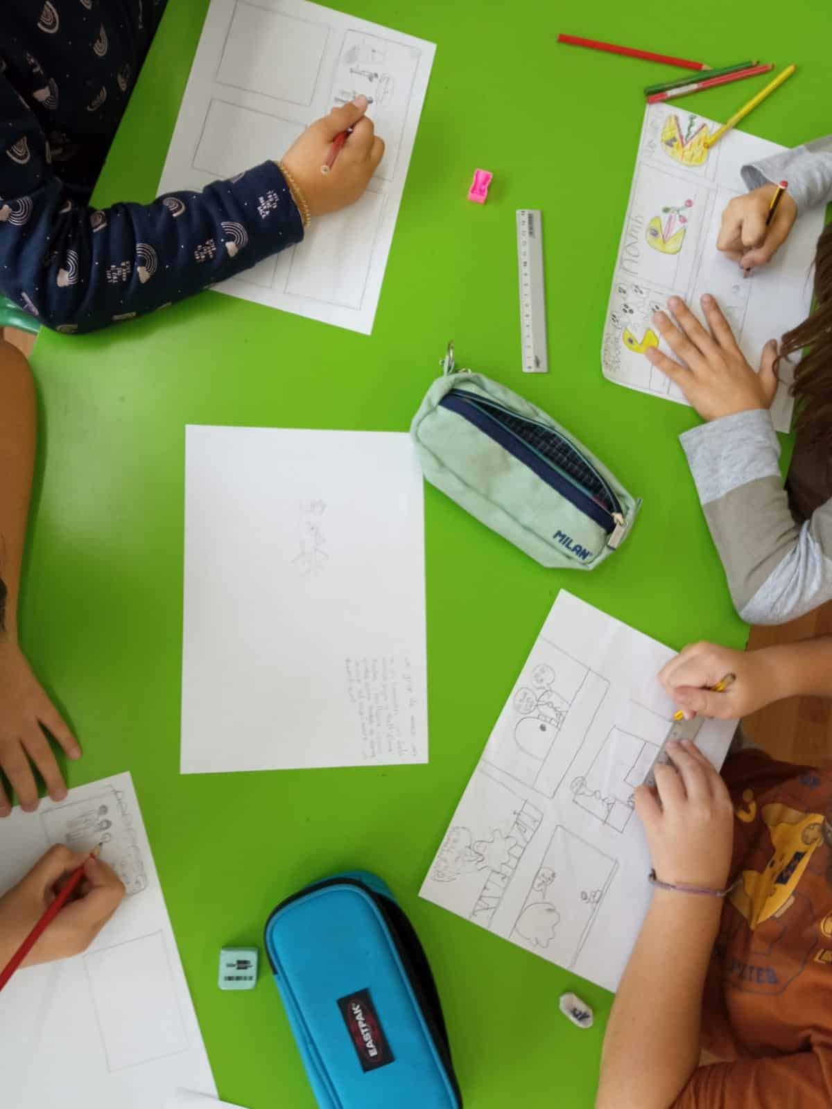 L’activitat de còmic és un curs progressiu. Comencem amb aspectes bàsics d’il·lustració (bàsics no vol dir simples, si no de base), aspectes que reforcen i milloren aquells que ja les coneixen i les aprenen de nou aquells qui no. En el segon trimestre ja entrem en el llenguatge del còmic i al tercer trimestre en el procés d’el·laboració del nostre còmic.