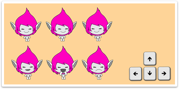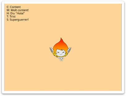 Fem que un personatge es mogui amb les fletxes del teclat i que canviï d’expressió: que plori, s’enfadi o rigui quan polsem altres tecles.